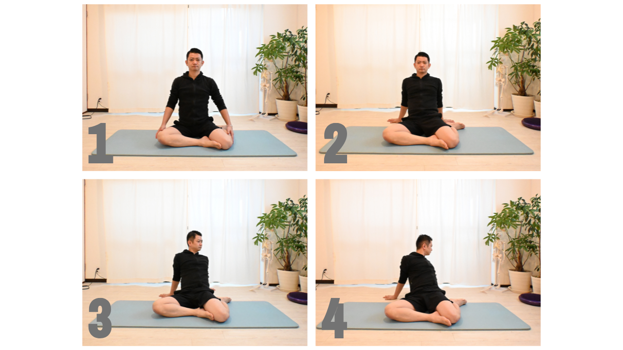 1.あぐら姿勢から左の股関節を内側に捻り、つま先が外を向くように座ります。