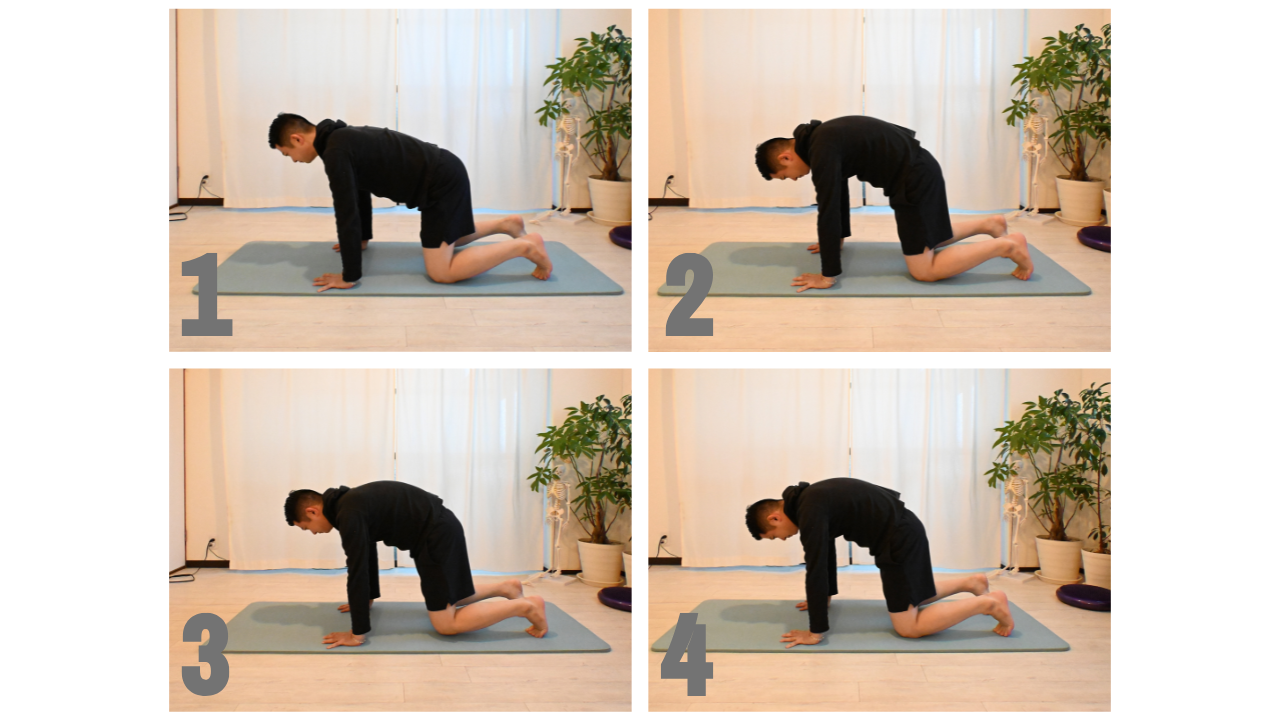 1.四つ這い姿勢になり、肩の真下に手のひら、股関節の真下に膝を置き、つま先を立てます。