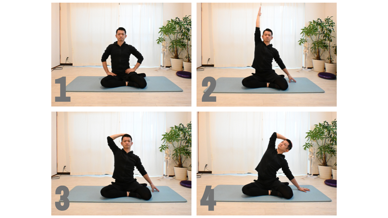 4の姿勢の際、肋骨を後ろに引く意識を持って肋骨が前に押し出されないように意識しましょう。
