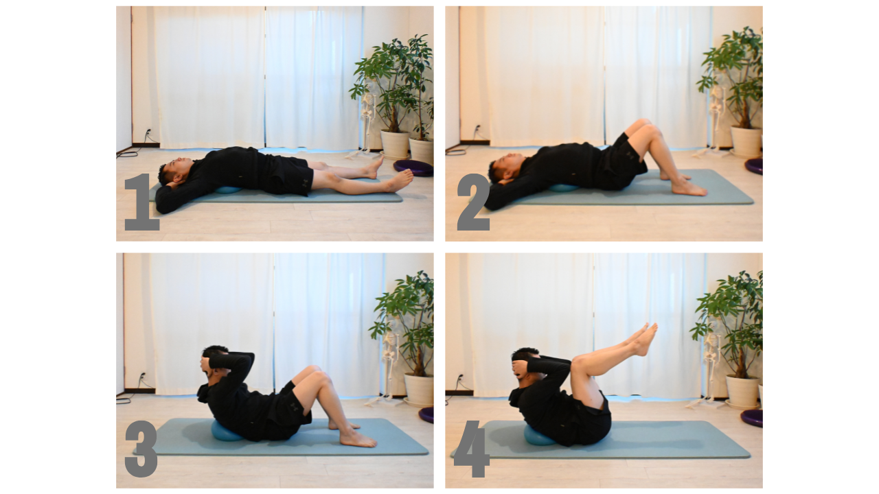 3.みぞおちの裏でスモールボールを押しながら上半身を起こします。
