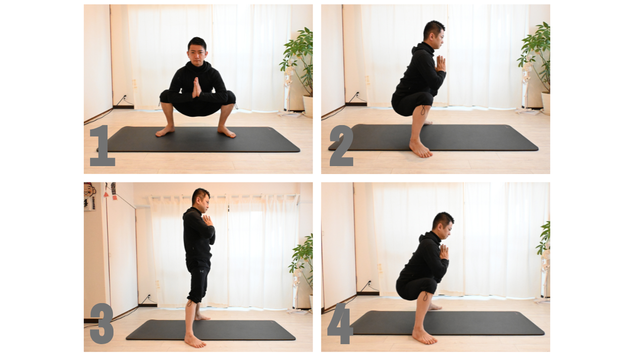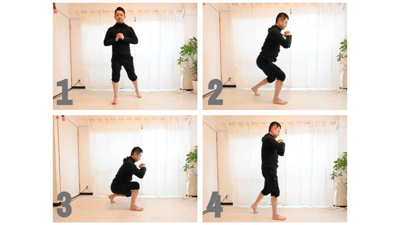 1.肩幅より広く足を開いて、しゃがみます。このとき、両手を胸の前で合わせます。