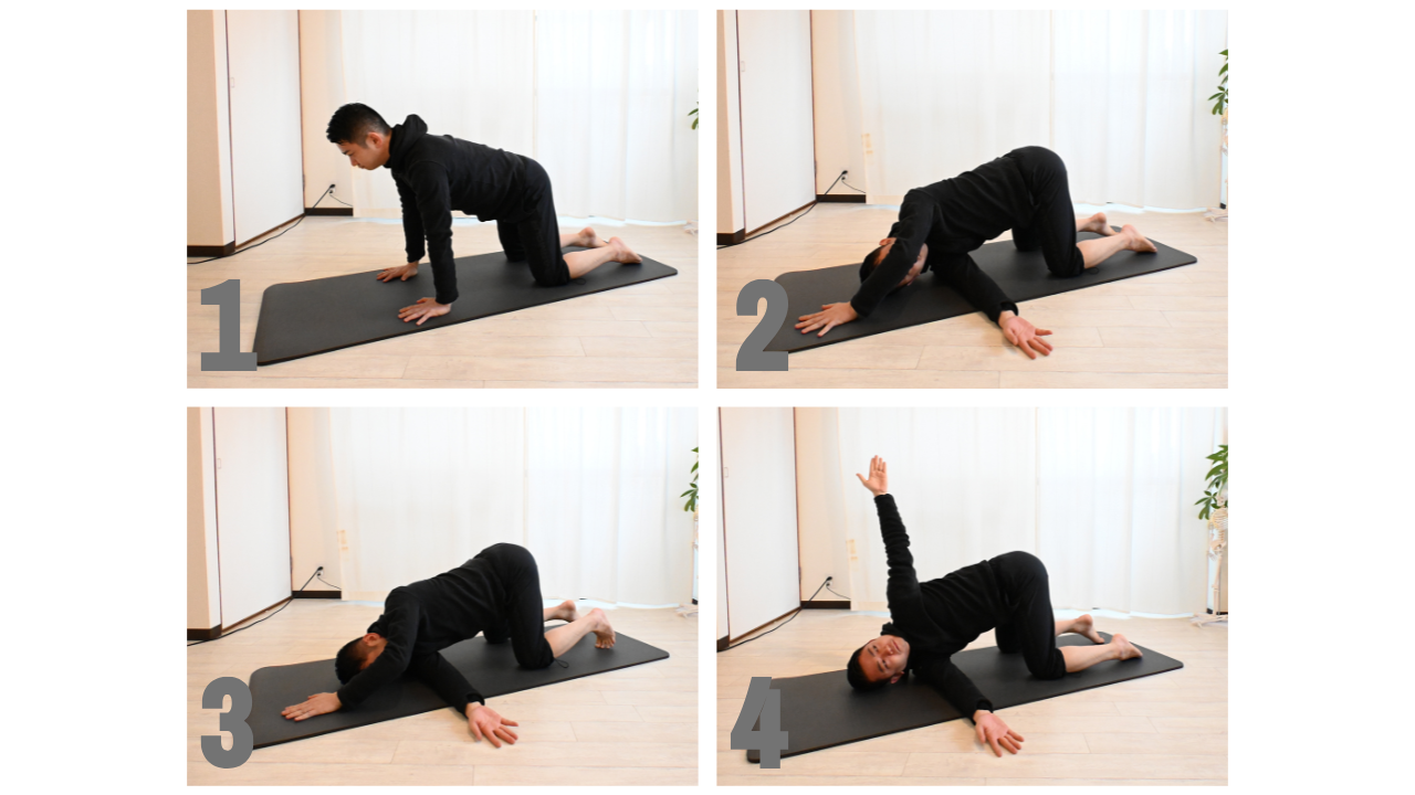 3と4の動作の際にみぞおちの裏でマットを押す力が抜けないように意識しましょう。