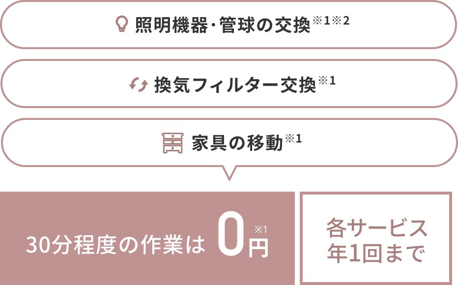 ※各専門会社のスタッフが対応いたします。※詳しくはお問い合せください。※1.一部(30分程度の作業であっても)有償となる場合がございます。※2.電球や蛍光灯は予めご用意ください。※3.ご優待価格にて対応します。