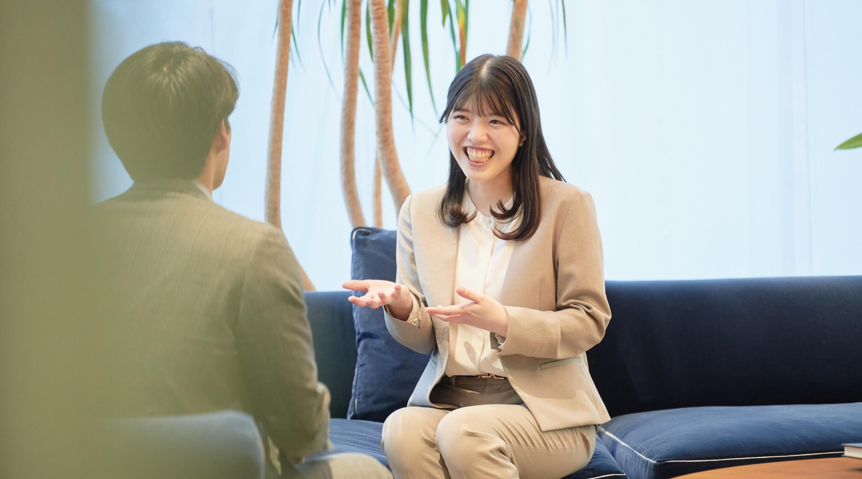 - 自分らしく納得感を持って働けると直感したからです。就職活動では「仕事を楽しめるか」「自分の価値観を大切にできるか」を軸に据えていました。昔から無理に続けるより納得して選択することを重んじてきたため、仕事選びでもそこは譲れませんでした。明和地所の先輩たちはみんな自然体。就活の相談にも親身に乗ってくれる優しさに触れここなら自分らしく働けると確信して入社を決めました。